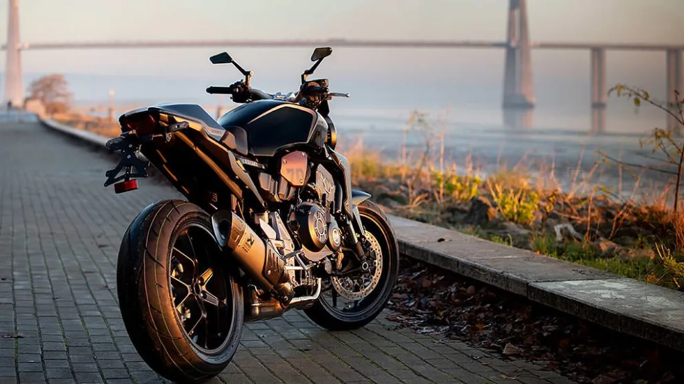 La meilleure façon de produire une monture standard sportive demeure de déshabiller une superbike comme la Honda CBR1000RR et de lui greffer un guidon droit. Si simple, qu’on se demande pourquoi il n’y a pas plus de «naked bike» conçus de cette manière. La CB1000R suit donc cette philosophie, une dérivée de la CBR, qui s’inspire des tendances rétro, un accastillage qui évoque subtilement certains codes du passé. Phare rond, lignes minimalistes, aucune fioriture, elle revient à l’essentiel. La finition demeure à la hauteur de la réputation du fabricant et son design - acclamé par toute la presse à son lancement - est une réussite. Et pour cause : elle conserve son sublime monobras oscillant qui laisse libre vue sur une magnifique jante de 17 pouces peintes noir satiné. Côté cadre, elle hérite des bases de la Honda CBR1000RR, qui lui font perdre au total 12 kilogrammes par rapport au modèle qu’elle remplace. Il se voit modifié et renforcé en torsion pour remplir son nouveau mandat et contenir la nouvelle fourche inversée à gros pistons Showa entièrement réglable. Le freinage se voit confié à une paire de disques de 310 mm à étriers radiaux à 4 pistons, tandis que le pneu arrière de bonne dimension (190/55 R 17) accentue l’effet de la configuration monobras.