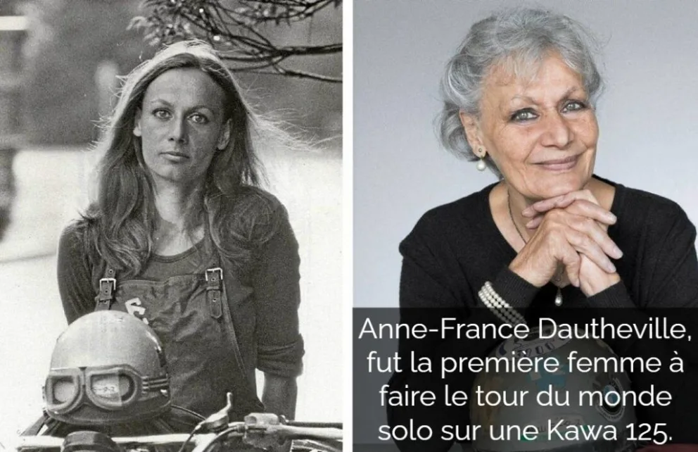 Avec son manteau court et serré, ses pantalons de cuir et ses bottes à talons hauts, la femme avait strictement le rôle d’être assise à l’arrière de cette belle bécane. Nous étions loin des vêtements adaptés pour la balade à moto, avec sa foule de technologies et de matériaux performants. Ces femmes des années 1970 n’avaient pas toutes la détermination de conduire une moto, comme Anne-France Dautheville, qui fut la première femme à faire le tour du monde solo sur une Kawa 125.