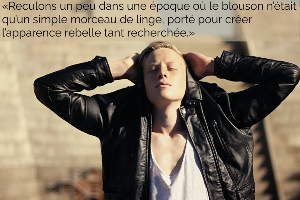 Reculons un peu dans une époque où le blouson n’était qu’un simple morceau de linge, porté pour créer l’apparence rebelle tant recherchée. Avoir belle allure sur sa moto était une préoccupation importante : conçu avec un tissu très mince, arborant un collet très long et décalé sur le devant, le blouson était orné d’une large fermeture éclair en décoration. L'élégance était une priorité à ce moment, c’est une évidence lorsqu’on consulte les revues des années 50-60. Alors que ce manteau procurait un côté mystérieux, sombre, et rebelle, il ne priorisait en aucun cas la sécurité quant aux possibilités de graves blessures lors de chutes à moto.