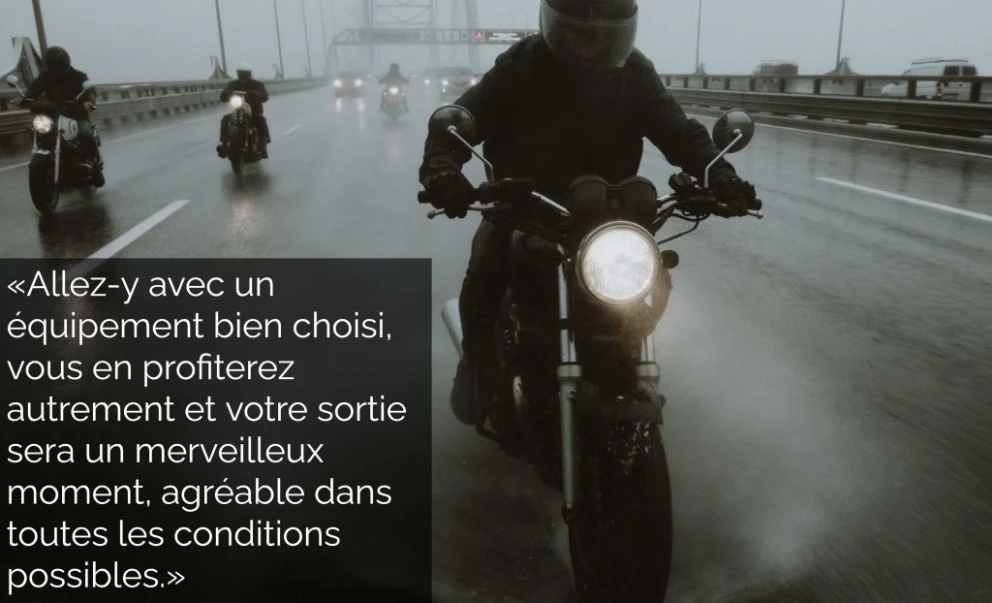 On sait que presque rien ne les arrête, car on a tous passé par là ! «Rider à tout prix ! Rien ne nous fait peur! Pas grave s’il pleut, je vais sécher !» Quand vous aurez, à plusieurs reprises, fait face aux conditions météo qui peuvent souvent vous prendre par surprise, il se pourrait bien que vous envisagiez de rouler derrière le volant d’un Jeep, au chaud, protégé de la pluie, du vent, du froid et de la poussière ! Mais un vrai motard, ça ne lâche pas ainsi ; ça vient avec un peu plus de sang-froid. Donc au moins, vous aurez une longueur d’avance en lisant ce texte. Allez-y avec un équipement bien choisi, vous en profiterez autrement et votre sortie sera un merveilleux moment, agréable dans toutes les conditions possibles. Parfois, il est préférable de prendre conscience que nous aurions besoin d'accompagnement et de suggestions vestimentaires. Dans plusieurs concessionnaires de moto, on retrouve des conseiller/ères aux vêtements qui se feront un plaisir de vous aider et de vous expliquer la gamme étendue de produits qui s’offrent à vous.