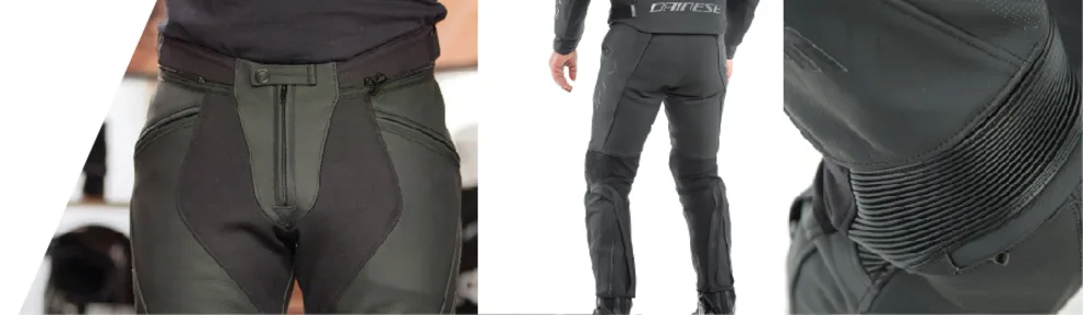 Nous vous présentons le fameux Pony3 de Dainese, qui est conçu en cuir pour la plupart de sa surface. Ce pantalon vous offre également des places stratégiques de mesh respirante au niveau de la fourche ainsi que derrière les genoux, afin d’apprécier son utilisation même en temps plus chaud. Il est muni de de protections certifiées au niveau des hanches et de protections rigides aux genoux, qui peuvent être ajustées ou retirées à l'aide de la fermeture éclair extérieure.